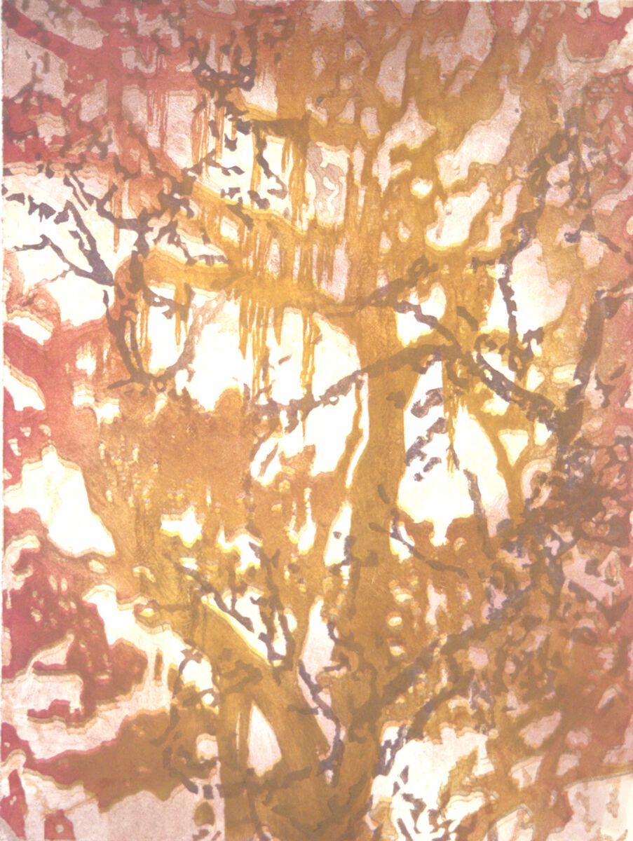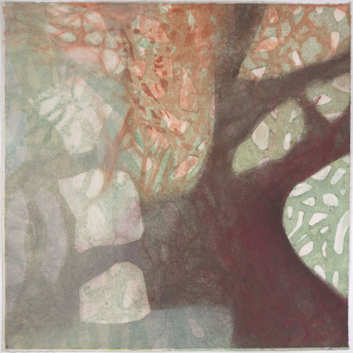 Rustling whisper - monoprint, relief, 2022; Akua intaglio on Rives BFK; 12"x12"