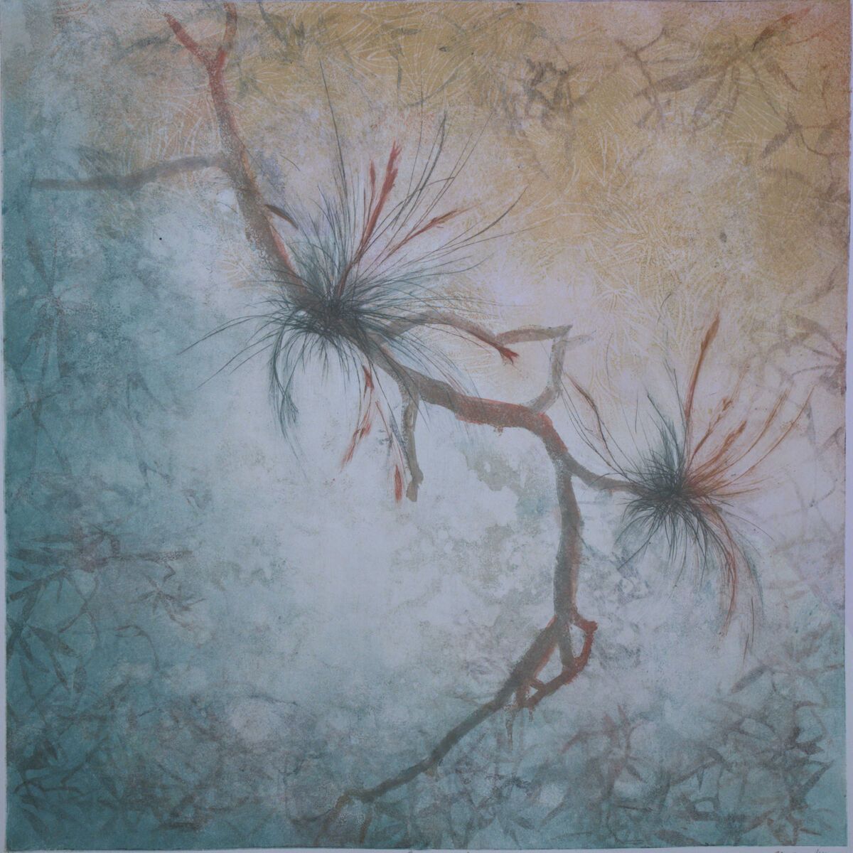 Floating on air - relief, drypoint, pochoir monoprint, 2023; Akua intaglio on Arnhem 1618; 18"x18"
